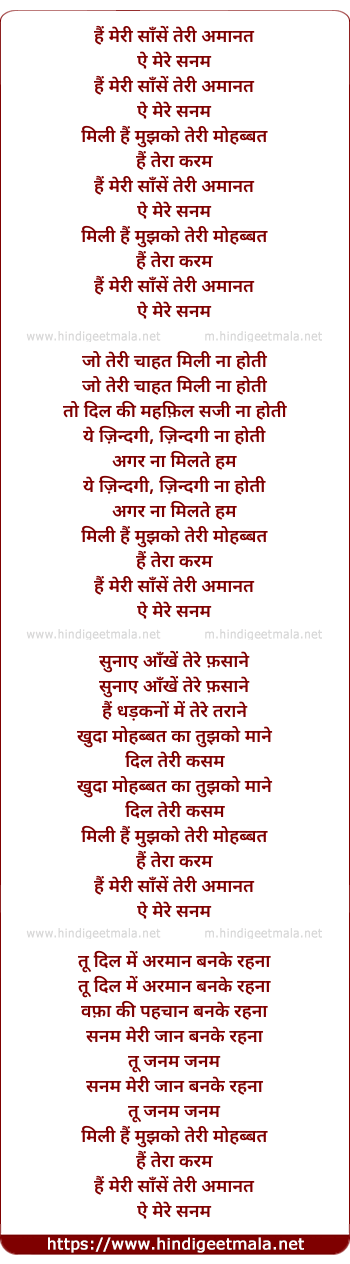 Lyrics of Hain Meri Saansein Teri Amanat - हैं मेरी साँसें तेरी अमानत