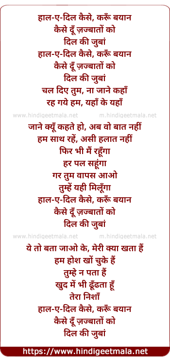 Lyrics of Hal -E - Dil - हाल-ए-दिल कैसे, करूँ बयान