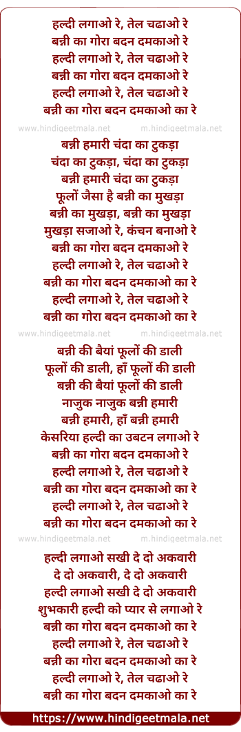 Lyrics of Haldi Lagaao Re - हल्दी लगाओ रे, तेल चढाओ रे