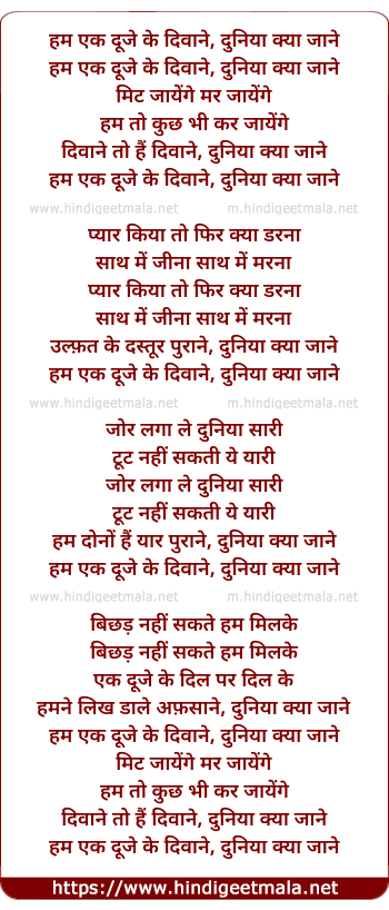 Lyrics of Ham Ek Dujhe Ke Diwane Duniya Kya Jane (Do Diwane) - हम एक दूजे के दिवाने दुनिया क्या जाने