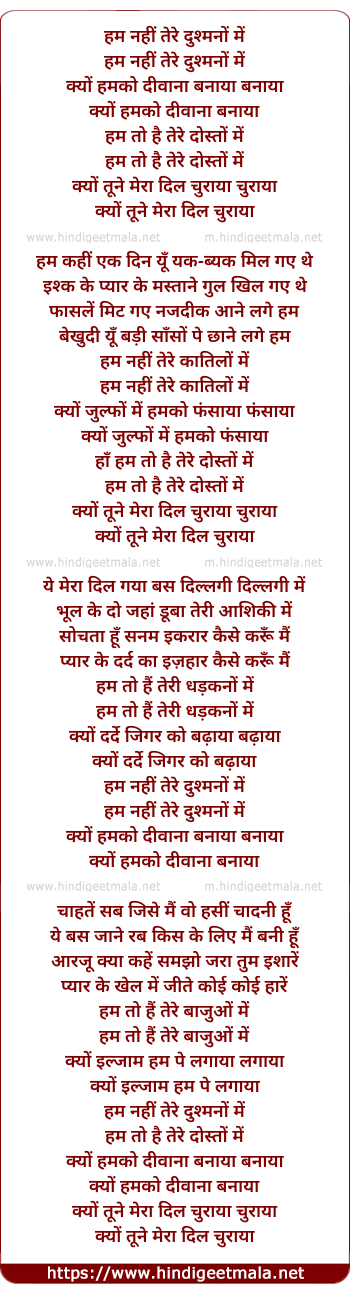 Lyrics of Ham Nahi Tere Dushmano Me - हम नहीं तेरे दुश्मनों में