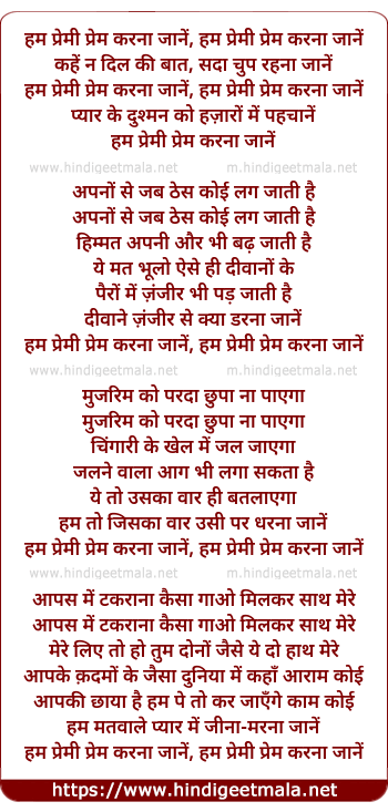 Lyrics of Ham Premee Prem Karana Jaane - हम प्रेमी प्रेम करना जानें, हम प्रेमी प्रेम करना जानें