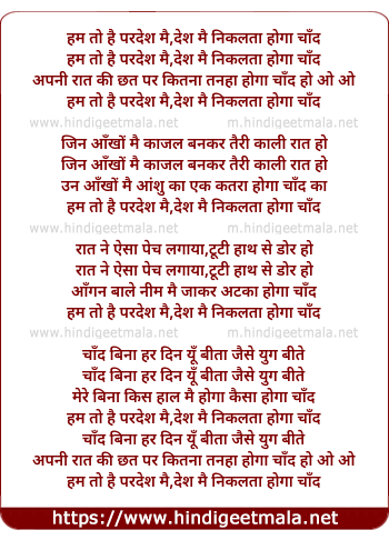 Lyrics of Ham To Hai Pardes Me, Des Me Nikla Hoga Chand - हम तो है परदेश मै,देश मै निकलता होगा चाँद