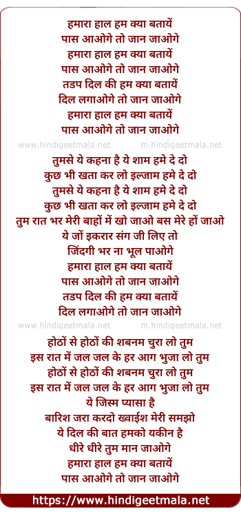 Lyrics of Hamara Hal Ham Kya Bataye - हमारा हाल हम क्या बतायें