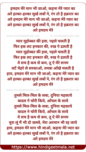 Lyrics of Hamdam Mere Maan Bhi Jaao, Kehna Mere Pyar Ka - हमदम मेरे मान भी जाओ, कहना मेरे प्यार का