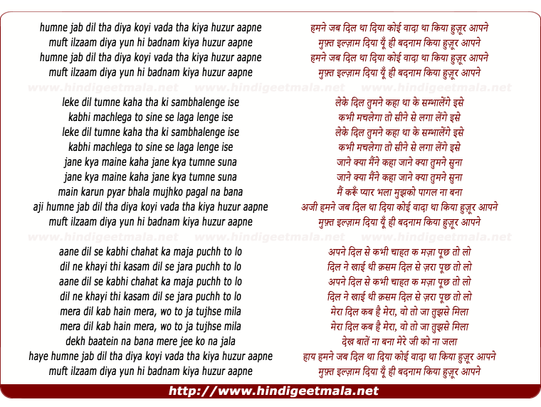 Lyrics of Hamane Jab Dil Tha Diya Koyi Vaada Tha Kiya - हमने जब दिल था दिया कोई वादा था किया हुज़ूर आपने