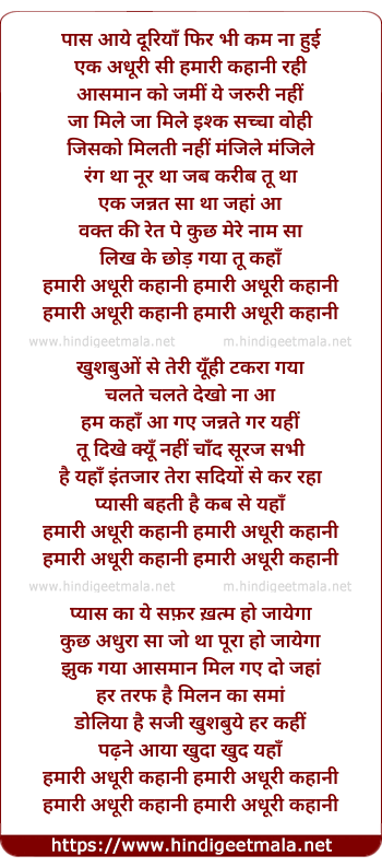 Lyrics of Hamari Adhuree Kahani (Encore) - हमारी अधूरी कहानी