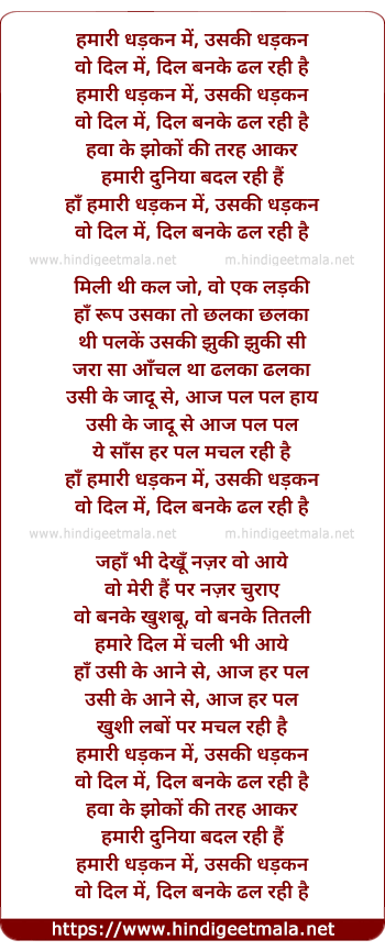Lyrics of Hamari Dhadkan Me Uski Dhadkan - हमारी धड़कन में, उसकी धड़कन