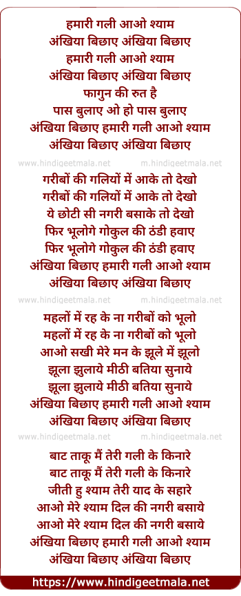 Lyrics of Hamaari Gali Aao Sham Ankhiya Bichaye - हमारी गली आओ श्याम अँखिया बिछाये