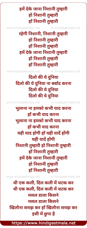 Lyrics of Hame De Ke Jana Nishani Tumhari - हमें देके जाना निशानी तुम्हारी