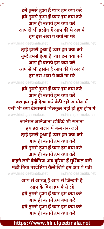 Lyrics of Hame Tumse Hua Hai Pyar - हमें तुमसे हुआ हैं प्यार हम क्या करे