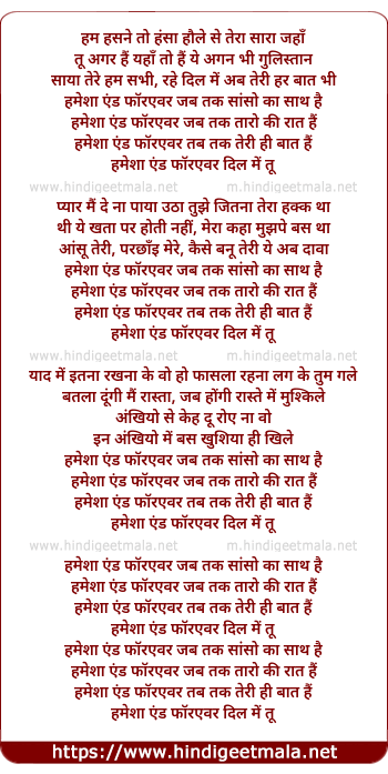 Lyrics of Hamesha Forever Dil Mein Tu - हमेशा फॉरएवर दिल में तू