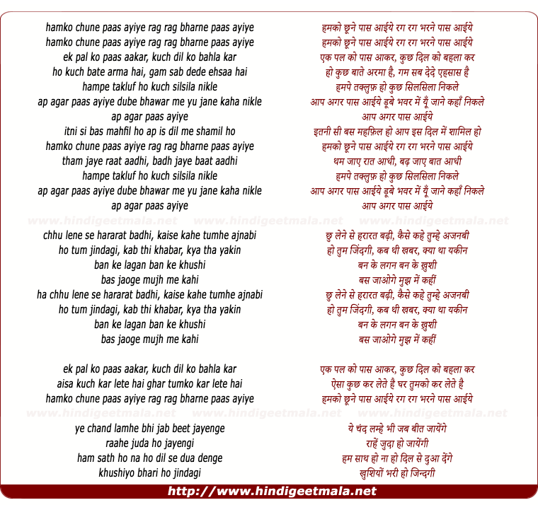 Lyrics of Hamko Chune Pas Ayiye Rag Rag Bharne Pas Ayiye - हमको छूने पास आईये रग रग भरने पास आईये