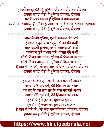 Lyrics of Hamko Samajh Baithee Hai Duneeya Divana - हमको समझ बैठी है दुनिया दीवाना