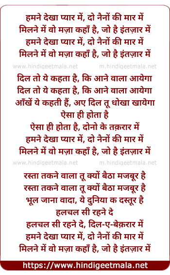 Lyrics of Hamne Dekha Pyar Me, Do Naino Kee Mar Me - हमने देखा प्यार में, दो नैनों की मार में
