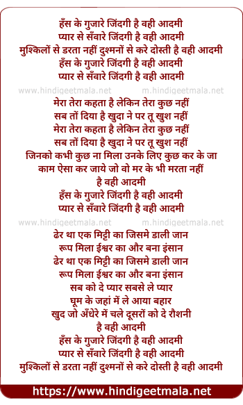 Lyrics of Hans Ke Guzari Zindagi Hai Wahi Aadmi - हँस के गुजारे जिंदगी है वही आदमी