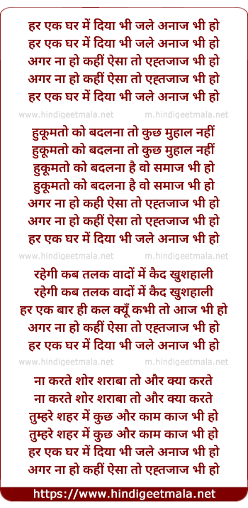 Lyrics of Har Ek Ghar Me Diya Bhee Jale - हर एक घर में दिया भी जले