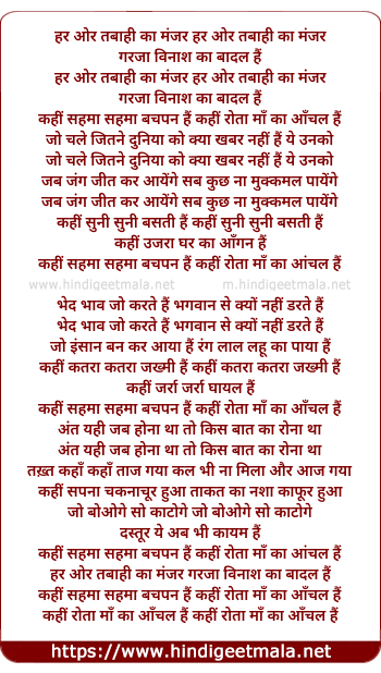 Lyrics of Har Ore Tabahi Ka Manzar - हर ओर तबाही का मंजर