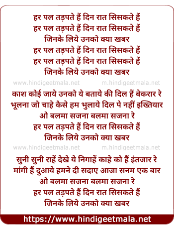 Lyrics of Har Pal Tadapte - हर पल तड़पते हैं दिन रात सिसकते हैं