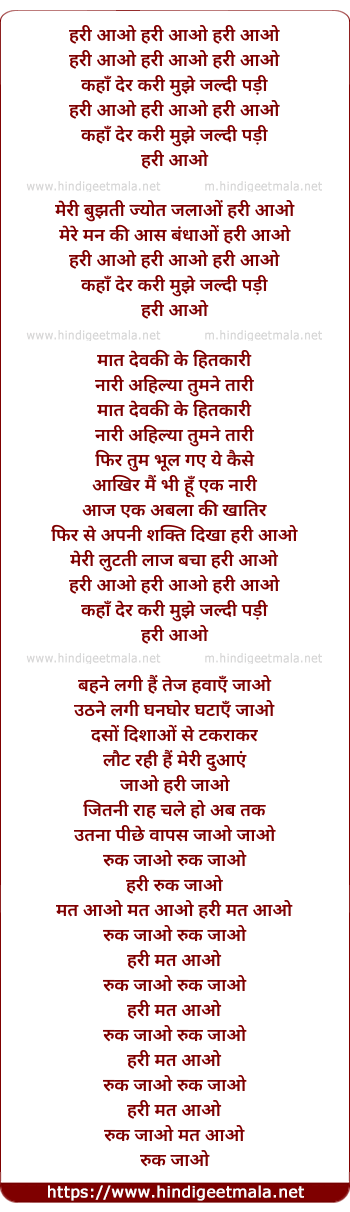Lyrics of Hari Aao Kahan Der Kari - हरी आओ कहाँ देर करी