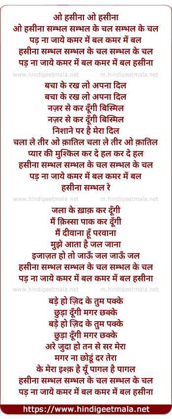 Lyrics of Hasina Sambhal Sambhal Ke Chal - हसीना संभल संभल के चल