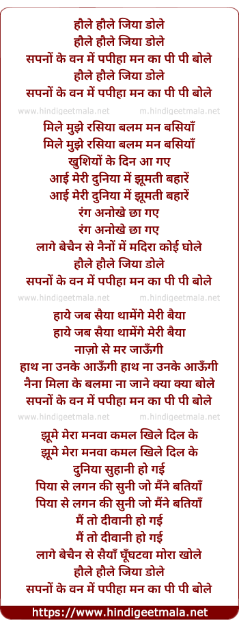 Lyrics of Haule Haule Jiya Dole - हौले हौले जिया डोले