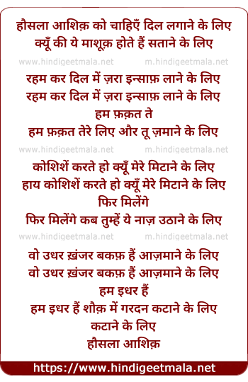 Lyrics of Hausalaa Aashiq Ko Chaahiye Dil Lagaane Ke Liye - हौसला आशिक़ को चाहिएँ दिल लगाने के लिए
