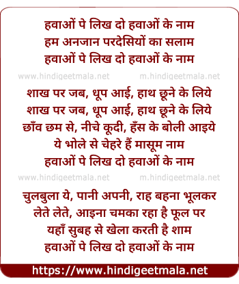 Lyrics of Hawaon Pe Likhdo Hawaon Ke Naam - हवाओं पे लिख दो हवाओं के नाम