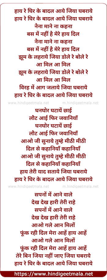 Lyrics of Haye Re Ghir Ke Badal Aaye - हाय रे घिर के बादल आये जिया घबराये