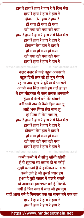 Lyrics of Haye Re Ye Dil Mera Kho Gaya Diwana Tera Ho Gaya - हाय रे ये दिल मेरा खो गया दीवाना तेरा हो गया