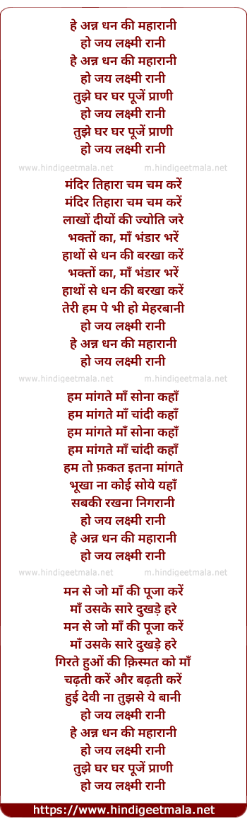 Lyrics of He Ann Dhan Ki Maharani - हे अन्न धन की महारानी