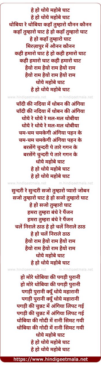 Lyrics of He Ho Dhoye Mahobe Ghaat, Dhobiya Re Dhobiya Kaha Tumharo - हे हो धोये महोबे घाट, धोबिया रे धोबिया कहाँ तुम्हारो