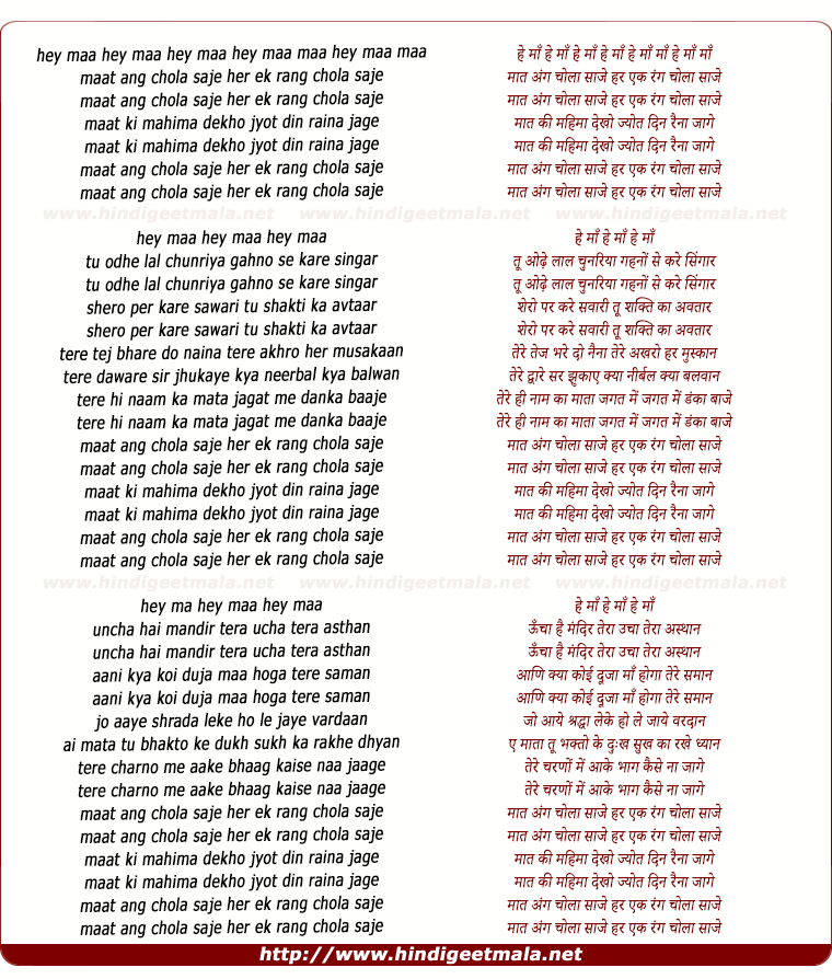 Lyrics of He Maa Maat Ang Chola Saaje, Har Ek Rang Chola Saje - हे माँ मात अंग चोला साजे, हर एक रंग चोला साजे