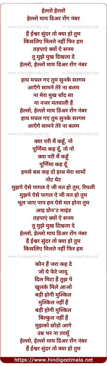Lyrics of Hello Hello My Dear - हेल्लो हेल्लो माय डिअर