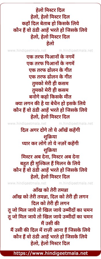 Lyrics of Hello Mr Dil Betaab Ho Kiske Liye - हेलो मिस्टर दिल बेताब हो किसके लिये