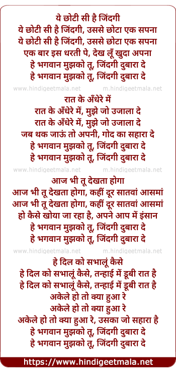 Lyrics of Hey Bhagwan Mujhko Tu - ये छोटी सी है जिंदगी