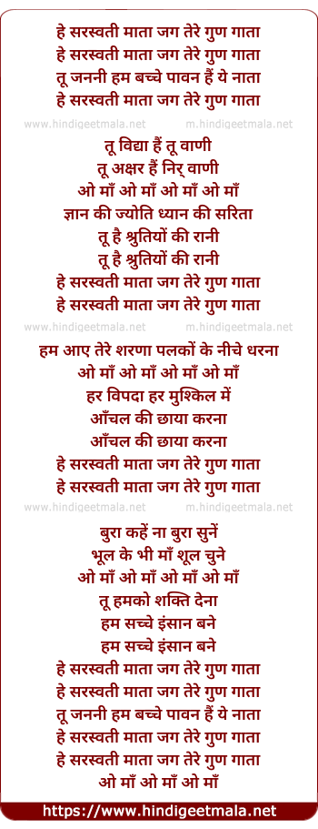 Lyrics of He Saraswati Mata - हे सरस्वती माता