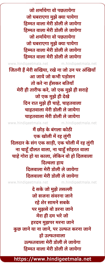 Lyrics of Himmat Wala Meri Doli Le Jayega - हिम्मत वाला मेरी डोली ले जायेगा