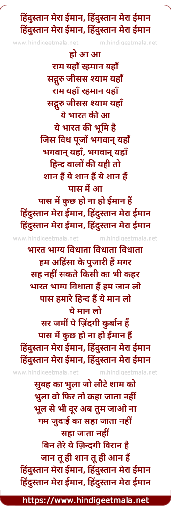 Lyrics of Hindustan Mera Imaan - हिंदुस्तान मेरा ईमान, हिंदुस्तान मेरा ईमान
