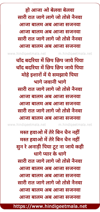 Lyrics of Ho Aaja O Belwa Sari Rat Jage - हो आजा ओ बेलवा सारी रात जागे
