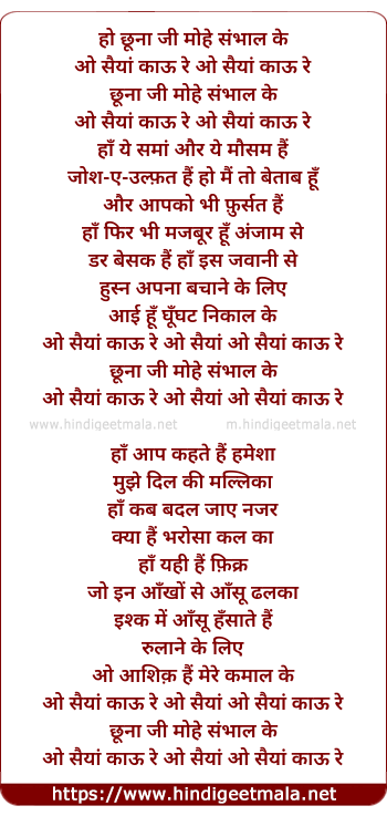 Lyrics of Ho Chuna Ji Mohe Sambhal Ke - हो छूना जी मोहे संभाल के