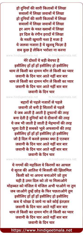 Lyrics of Ho Duniya Ki Sari Kitabo Me Likha - हो दुनियाँ की सारी किताबों में लिखा