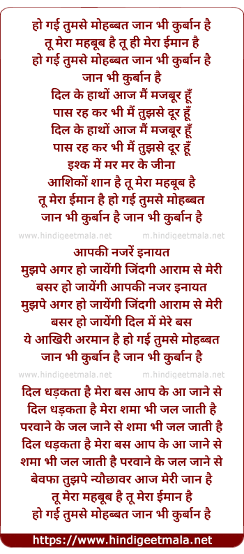 Lyrics of Ho Gayi Tumse Mohabbat - हो गई तुमसे मोहब्बत