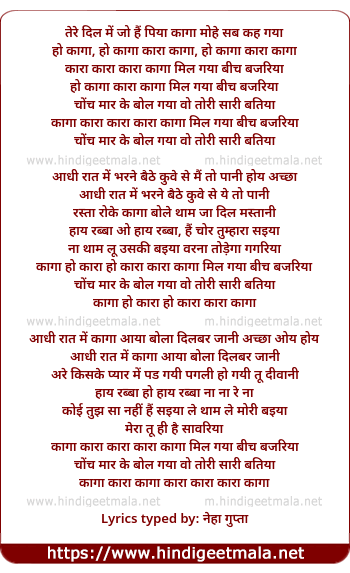 Lyrics of Ho Kaga Kara Kaga, Kara Kara Kaga Mil Gaya Bich Bajariya - हो कागा कारा,कागा कारा कारा कागा मिल गया बीच बजरिया