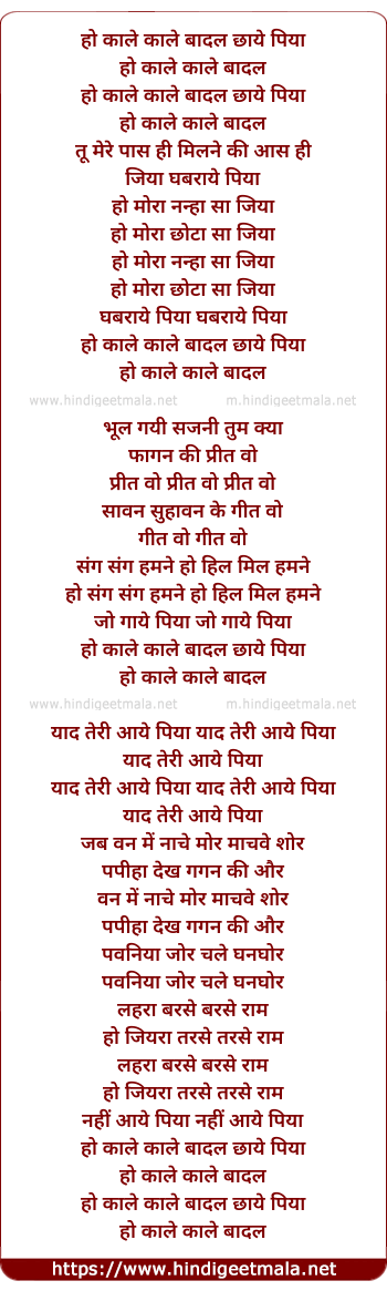 Lyrics of Ho Kale Kale Badal Chaye Piya - हो काले काले बादल छाये पिया