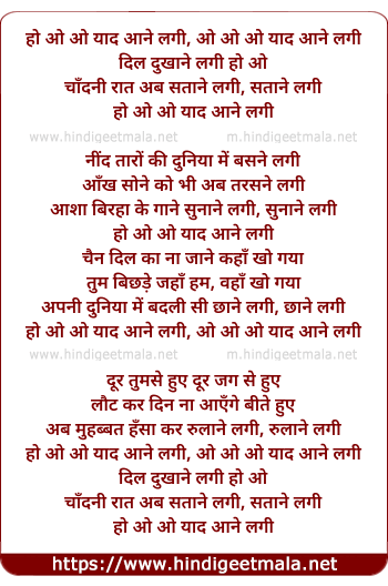Lyrics of Ho O O Yad Aane Lagee Dil Dukhane Lagee - हो ओ ओ याद आने लगी दिल दुखाने लगी