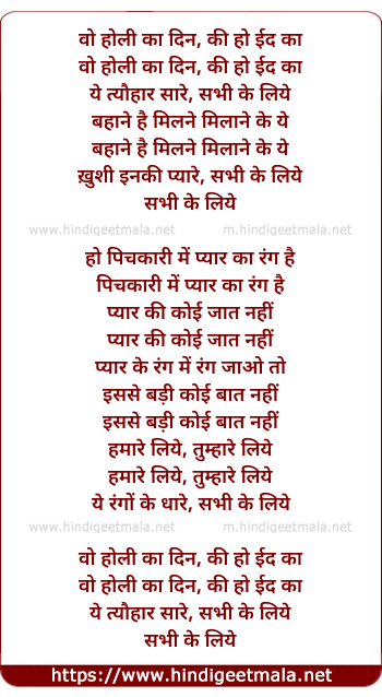 Lyrics of Holi Aayi Holi Mastano Ki Toli (Ii) - वो होली का दिन, की हो ईद का