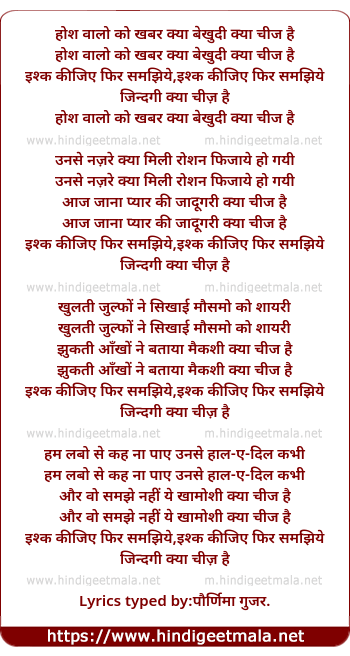 Lyrics of Hosh Walo Ko Khabar Kya Bekhudi Kya Cheez Hai - होश वालो को खबर क्या बेखुदी क्या चीज है