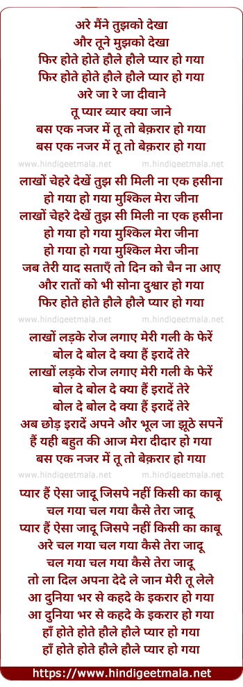Lyrics of Hote Hote Haule Haule Pyar Ho Gaya - होते होते हौले हौले प्यार हो गया