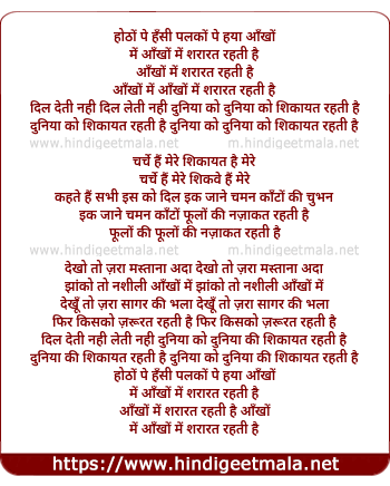 Lyrics of Hotho Pe Hasi Palko Pe Haya, Aankho Me Sharart Rehti Hai - होठों पे हँसी पलकों पे हया, आँखों में शरारत रहती है